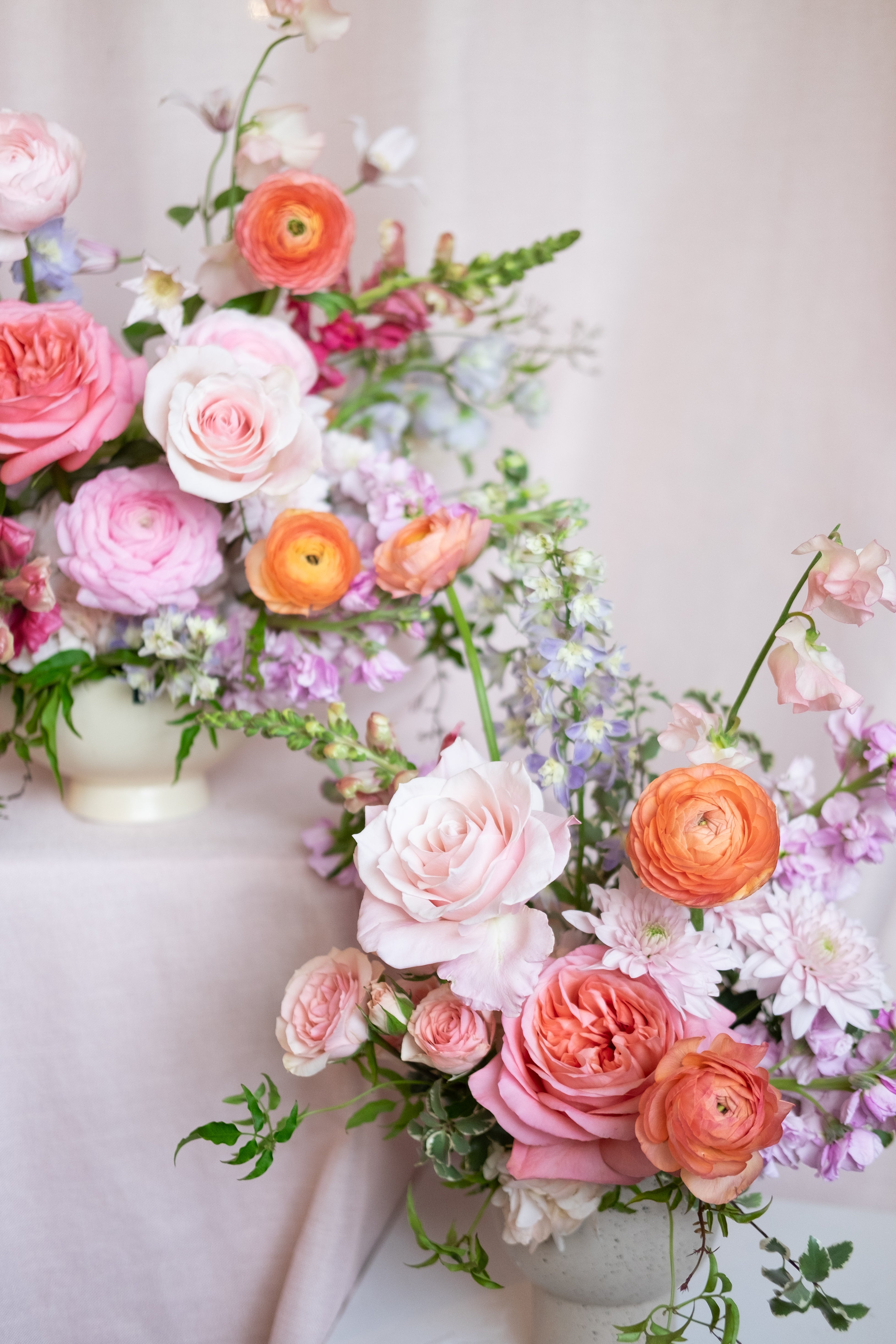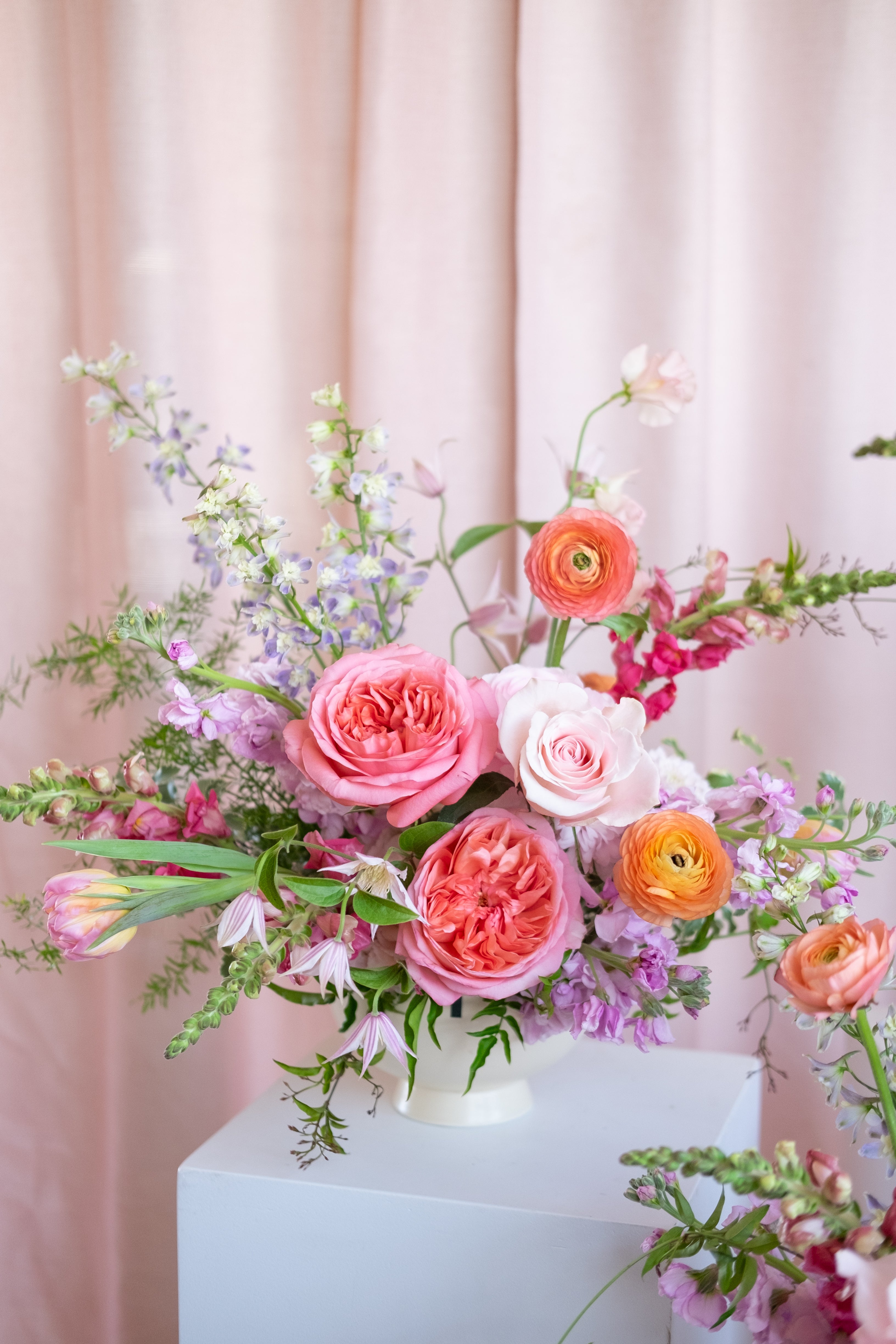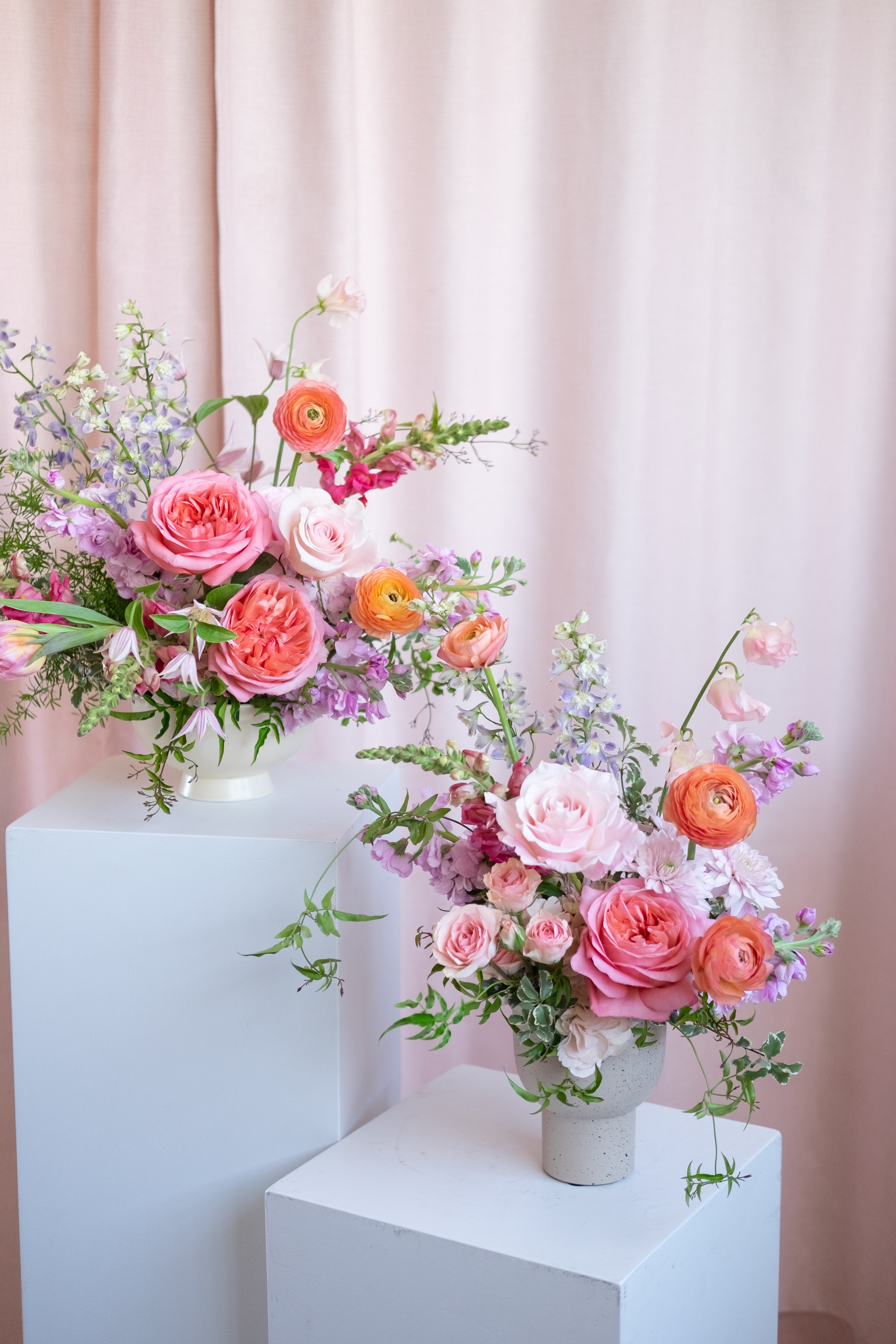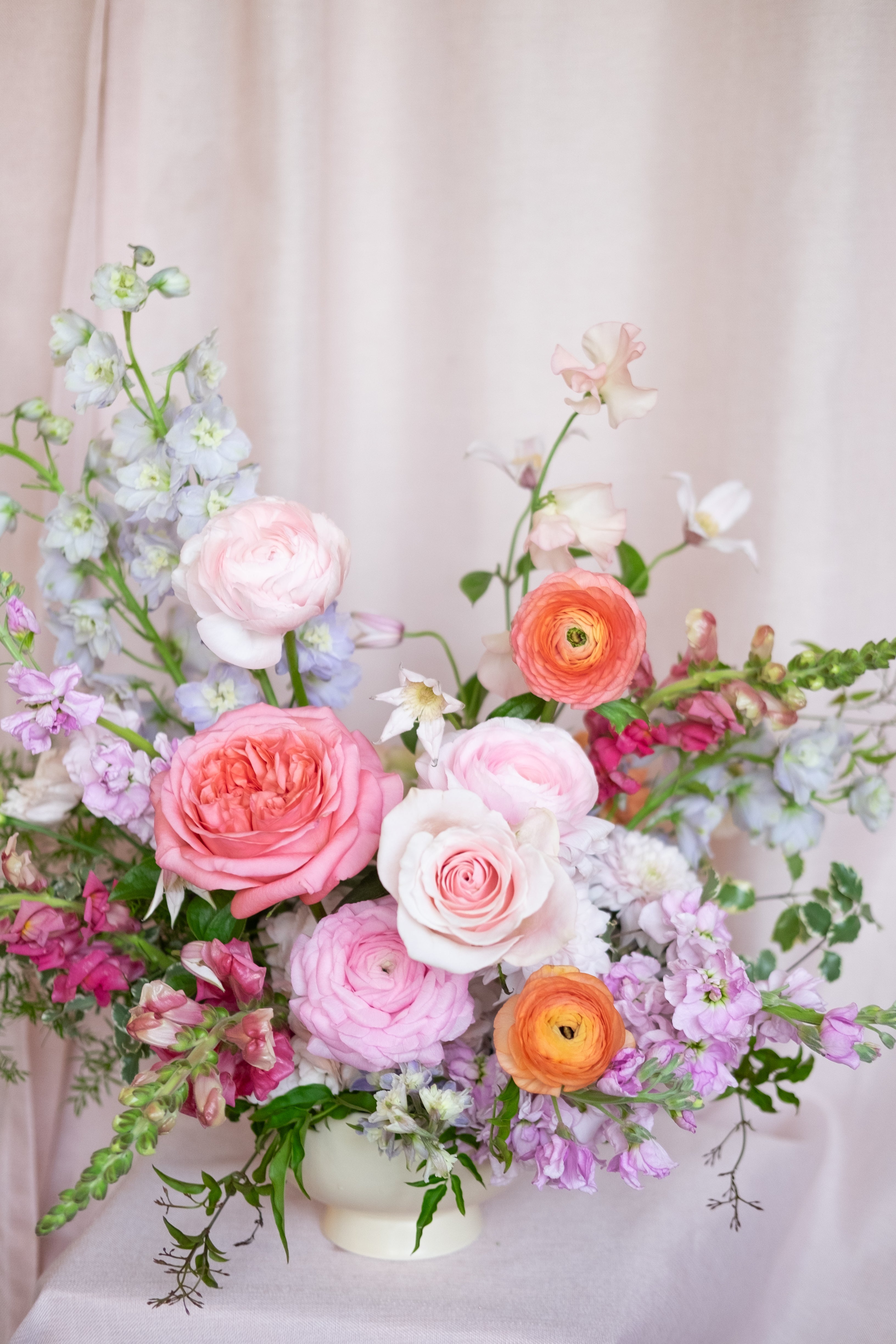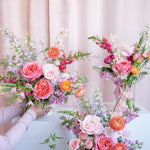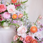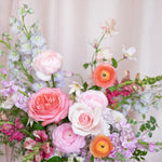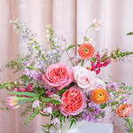 Our Designer Choice Valentine's Day arrangement features seasonal flowers in a pastel palette including pinks, lavender, peach, yellow, arranged in an our signature style. Designer choice of glass or ceramic vase.